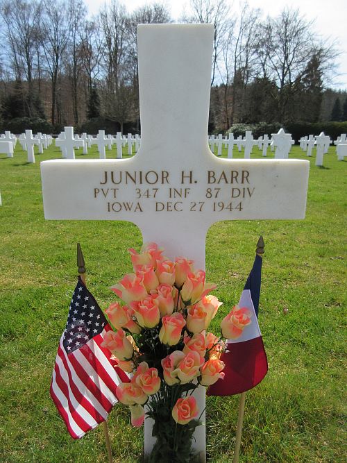 Pvt Junior H. Barr enlisted on 14 February 1944.He was reported slightly wounded in action on 19 December 1944 and died on 27 December 1944 in a hospital in France.