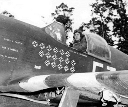 "I was flying No. 2 man on wing of Maj Don M. Beerbower, who was leading 353rd Fighter Squadron on an armed reconnaissance mission. We went down to strafe an airfield North of Reims. Our first pass was from north to south, firing at twin-engine E/A in revetments. I noticed Maj Beerbower got hits on an E/A. We came off the field, circled to the right, and made a pass from east to west to knock out gun emplacements as Blue and Green flights made a pass at planes in revetments. As we came in range, in line-abreast formation, the guns opened fire on us, and we returned the fire. Maj Beerbower silenced one gun and pulled up straight as we left. I saw hits on his wing, and the canopy was gone. The plane was climbing, and it appeared that the Major was hit. The plane climbed until it partially stalled, half-rolled and nosed straight down in a dive, exploding when it hit the ground. The pilot fell free while it was in the vertical dive, but no apparent attempt was made to open his chute."