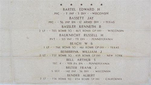 S/Sgt Frank J. Belter was married to Lela Kagel on 6 April 1940.He was awarded the Silver Star Medal posthumously. The citation cited: For conspicuous gallantry and intrepidity in action while serving with Company I, 142nd Infantry Regiment, 36th Infantry Division, in action on 11 February 1945 in France. While attacking well-fortified houses in an enemy held town, S/Sgt Belter volunteered to lead his squad across open, fire-swept terrain into a group of houses where they could deliver fire on the enemy's rear. Fully aware of the danger involved he started to advance across the open space. While running towards his objective S/Sgt Belter was killed by machine-gun fire. His heroic action inspired his comrades to renewed aggressiveness against the hostile force.