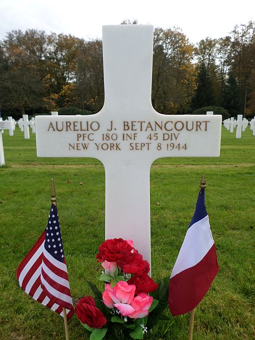 Pfc Aurelio J. Betancourt attended high school for two years and was a porter before he enlisted at Fort Dix, New Jersey on 5 February 1942.He was first buried at the Temporary American Military Cemetery in Saint-Juan, France.