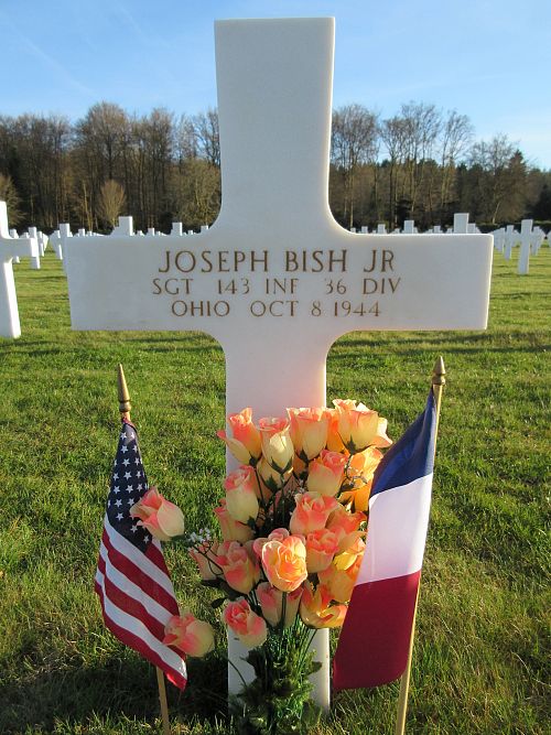 Sgt Joseph Bish was married to Winifred Beatrice Lear in 1941. He enlisted in Akron, Ohio on 17 May 1943.Source of information: André Koch, www.abmc.gov, www.wwiimemorial.com, www.archives.gov - WWII Enlistment Record, www.ancestry.com - 1930/1940 Census / Headstone and Interment Record / U.S. WWII Draft Cards Young Men / https://36th-id.frb.io / 143rd-October-1944-to-end.pdf