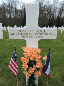 Sgt Joseph F. Boch was killed at Advance Landing Ground A-71, Clastres, France, when a B-26C, #42-107844, returning from an operational mission crashed at the East-West runway and immediately burst into flames. Two crash crews arrived at the scene of the crash at 1134 hours. The crash crew with the aid of the Medical Corps had rescued two of the wounded crew members. In an attempt to rescue the third member the bomb load which the plane was carrying detonated and resulted in his death.