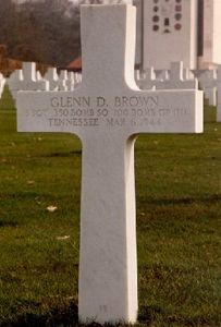 S/Sgt Glenn D. Brown attended college and was a welder before he enlisted at Camp Forrest, Tennessee on 12 November 1942.Flak knocked out #4 engine and caused damage in other places. It crash landed near the road from Halenbeck tot Freienstein. Witnesses on the ground saw it circling several times around Halenbeck with one engine stopped, which was smoking and was probably on fire. After loosing altitude, it finally attempted a belly landing, 300 m north of Halenbeck. During this maneuver, the aircraft touched the trees and the great stoneblocks lying around and overturned several times and was finally torn into pieces. The left wing probably exploded.