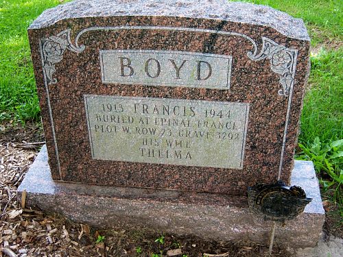 Sgt Francis E. Boyd entered military service on 3 August 1943. He had been overseas since January 1944 and participated in the battle of Anzio Beachhead and Rome and took part in the invasion of Southern France.He died on 28 November in France as the result of wounds received on 27 November 1944.
