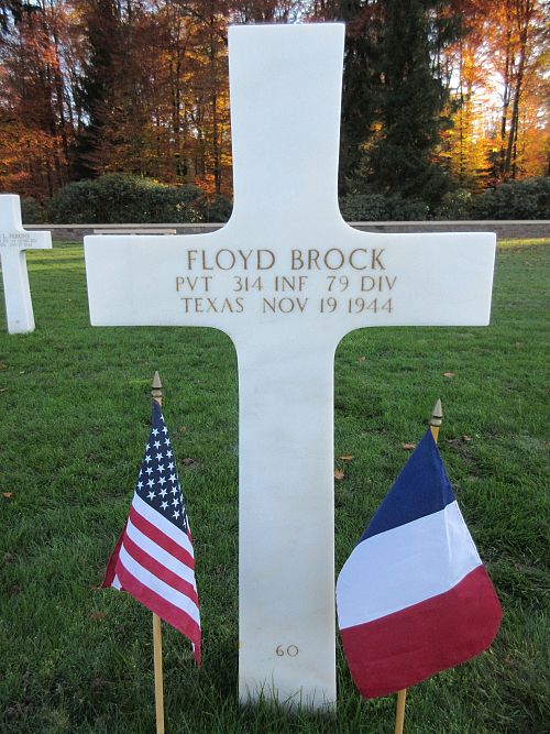 Pvt Floyd Brock attended high school for two years and worked on a farm before he enlisted in Lubbock, Texas on 18 December 1943.His brother Loyd Brock, is buried at Lorraine American Cemetery.