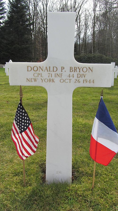 Cpl Donald P. Bryon graduated from Brooklyn Technical High School and attended the University of Virginia. He was employed by the Sperry Gyroscope Company.He enlisted in New York City, New York on 23 April 1943 and was training as an engineer in the A.S.T.P. program before being transferred to an infantry unit. He was sent overseas in September 1944.