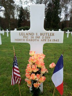 Pvt Leland I. Butler enlisted in May 1942 and was sent overseas in October 1943.He was wounded in Normandy in June 1944 and recovered at a hospital in England.