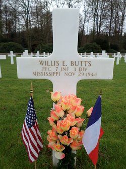 Pfc Willis E. Butts attended high school for four years and was employed by the Schlumberger Well Surveying Corporation.He enlisted in August 1943 and had his basic training at Fort McClellan, Alabama and Fort George G. Meade, Maryland from where he was sent overseas in February 1944.
