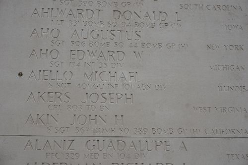 S/Sgt Michael Aiello volunteered for the U.S. Army in Peoria, Illinois on 24 March 1942. He was a miner before he joined the army.In May 2016, the Defense POW/MIA Accounting Agency exhumed the remains of an Unknown Soldier buried in Plot A Row 40 Grave 45 at Ardennes American Cemetery with the belief that an identification could be made. Research and analysis were used to positively identify the remains as belonging to S/Sgt Michael Aiello, who was listed Missing in Action since 30 September 1944.