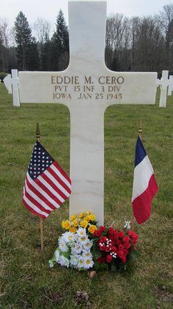 Pvt Eddie M. Cero enlisted on 7 December 1942.In November 1944 he was wounded by artillery shell fragments in his leg.