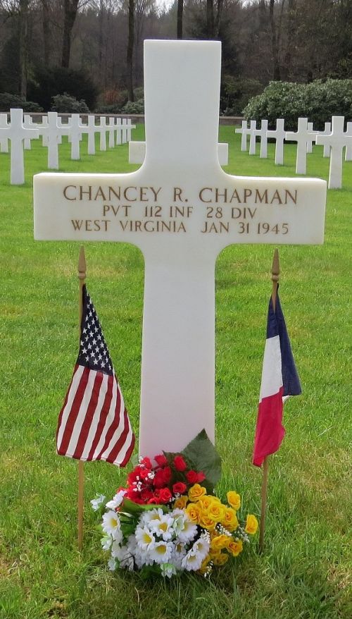 Pvt Chancey R. Chapman was a graduate of Gauley Bridge High School in 1943 and was employed by the Nicholas-Webster Coal Company.Source of information: Peter Schouteten, www.abmc.gov, www.wwiimemorial.com, www.ancestry.com - Headstone and Interment Record / West Virginia Births Index / 1930 Census / U.S. WWII Draft Cards Young Men, http://112th-infantry.blogspot.com, West Virginia Memory Project