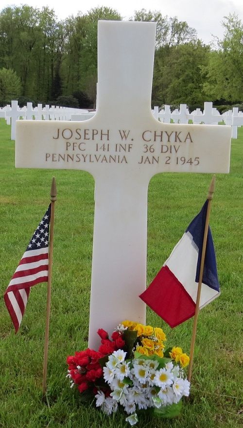 Pfc Joseph W. Chyka enlisted in Pittsburgh, Pennsylvania on 27 December 1943.Source of information: André Koch, www.abmc.gov, www.wwiimemorial.com, www.archives.gov - WWII Enlistment Record, www.ancestry.com - Headstone and Interment Record / 1920/1940 Census / U.S. WWII Draft Cards Young Men / Pennsylvania, Veteran Compensation Application File WWII / https://36th-id.frb.io / 141aar-December-1944-to-end.pdc