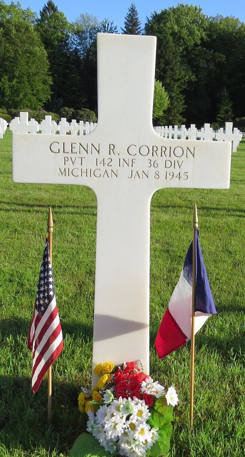 Pvt Glenn R. Corrion was married to Fidelis Lillian White on 28 October 1944.Source of information: André Koch, www.abmc.gov, www.wwiimemorial.com, www.ancestry.com - Headstone and Interment Record / 1930 Census / U.S. WWII Draft Cards Young Men 1940-1947 / Michigan Marriage Records 1867-1952 / 142ndaar-.pdf / https://36th-id.frb.io