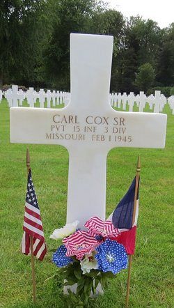 Pvt Carl Cox Sr. was a filling station attendant before he enlisted at Fort Leavenworth, Kansas on 15 July 1944.His brother Alfred, a merchant marine man, was killed on 3 March 1943 when his ship, the SS Meriwether Lewis, part of the Murmansk Convoy HX 227 was torpedoed by U-634 in the Atlantic Ocean, southwest of Iceland. He is remembered at the Tablets of the Missing at Cambridge American Cemetery and Memorial.
