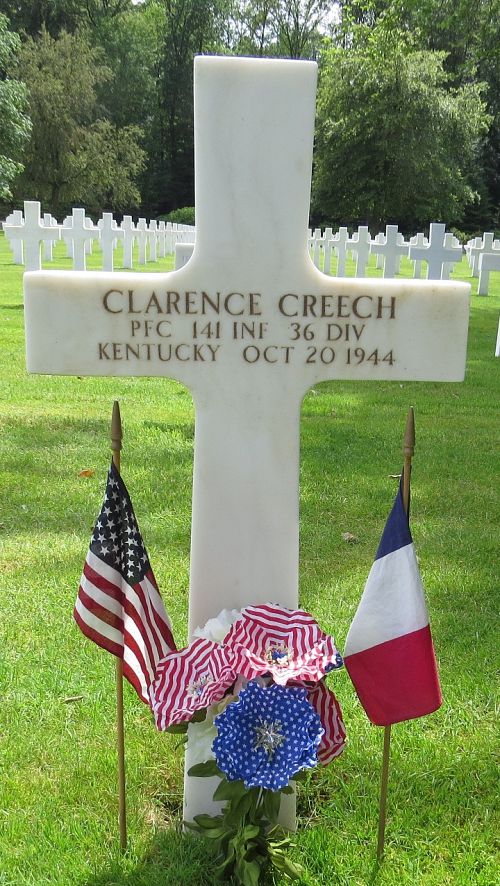 Pfc Clarence Creech enlisted at Fort Thomas, Kentucky on 19 February 1942.Source of information: André Koch, www.abmc.gov, www.wwiimemorial.com, www.archives.gov - WWII Enlistment Record, www.ancestry.com - Headstone and Interment Record / 1920/1930/1940 Census / U.S. WWII Draft Cards Young Men 1940-1947 / Kentucky Birth Index 1911-1999 / 141aar-October-November-1944.pdf / https://36th-id.frb.io