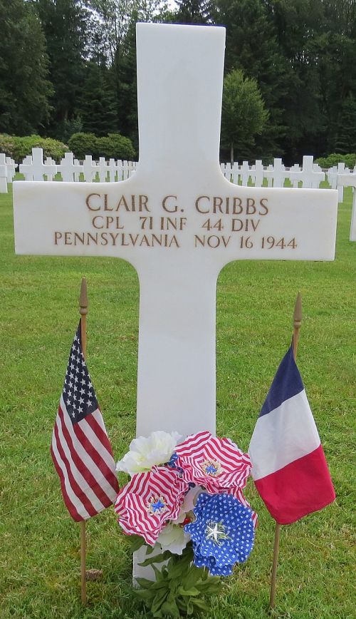 Cpl Clair G. Cribbs graduated from Blairsville High School in 1941 and attended Greensburg Business College for 1 year. He was the manager of the Globe Theater in Latrobe.He enlisted in Altoona, Pennsylvania on 20 February 1943. He was sent overseas on 31 August 1944.