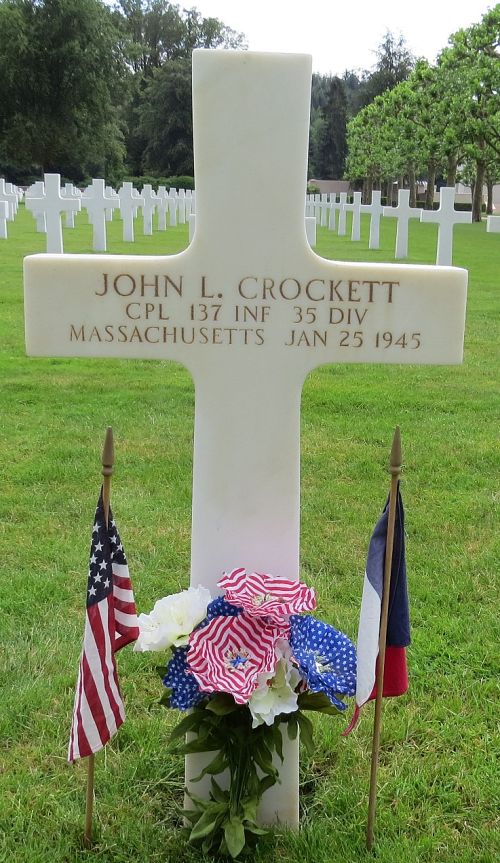 Cpl John L. Crockett attended college for one year and was employed with the U.S. Forest Service before he enlisted in Boston, Massachusetts on 12 April 1943.Source of information: Peter Scouteten, www.abmc.gov, www.wwiimemorial.com, www.archives.gov - WWII Enlistment Record, www.ancestry.com - Headstone and Interment Record / U.S. WWII Draft Cards Young Men / Crockett Family Tree, After Action Report 35th Infantry Division