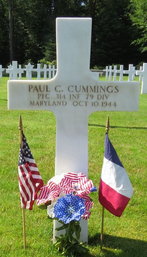 Pfc Paul C. Cummings attended high school for two years and was a brakeman for the Baltimore & Ohio Railroad before he enlisted at Fort Meyer, Virginia on 22 June 1942.He was killed by a land mine.