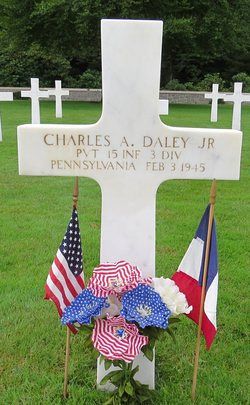 Pvt Charles A. Daley Jr. was a warehouse keeper employed by the National Biscuit Co. before he enlisted in Allentown, Pennsylvania on 3 April 1943.He was wounded by artillery shell fragments in the kidneys and died of his wounds on 3 February 1945. The exact date when he was reported wounded in action or the location where he died, is not known.