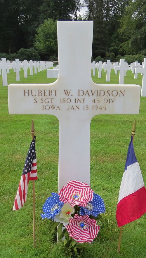 S/Sgt Hubert W. Davidson attended high school for 4 years before he enlisted in Camp Dodge Herrold, Iowa on 24 August 1943.Source of information: Peter Schouteten, Carla Mans, www.abmc.gov, www.wwiimemorial.com, www.archives.gov - WWII Enlistment Record, www.ancestry.com - Headstone and Interment Record / Harris Family Tree / 1930 Census / U.S. WWII Draft Cards Young Men, http://www.45thdivision.org