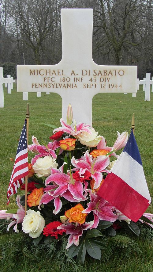 Pfc Michael A. Di Sabato was first buried at the Temporary American Military Cemetery in Saint-Juan, France.Source of information: Peter Schouteten, www.abmc.gov, www.wwiimemorial.com – Yolanda M. Hamilton, www.ancestry.com - Headstone and Interment Record / Pennsylvania Veteran Compensation Application Files WWII / U.S. WWII Draft Cards Young Men, http://www.45thdivision.org, www.findagrave.com – Don J