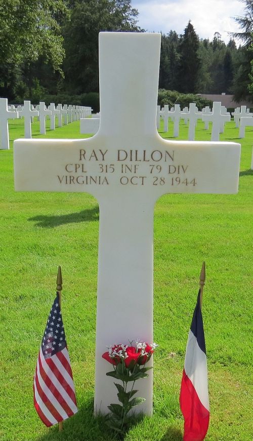 Cpl Ray Dillon worked on his own farm before he enlisted in Roanoke, Virginia on 11 November 1942.He was killed by artillery shell fragments to his thigh.