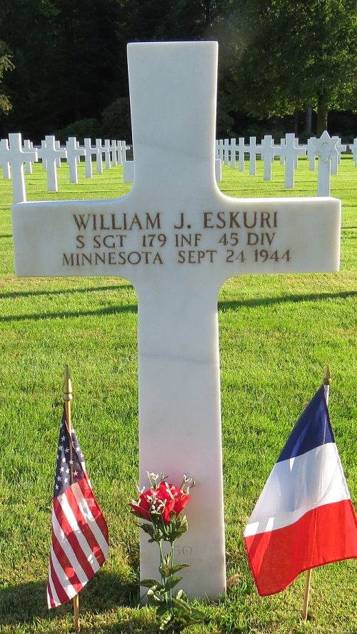 S/Sgt William J. Eskuri was first buried at the Temporary American Military Cemetery in Saint-Juan, France.Source of information: Peter Schouteten, www.abmc.gov, www.wwiimemorial.com, www.ancestry.com - Headstone and Interment Record / 1920 Census / 1930 Census / Minnesota Birth Index, http://www.45thdivision.org