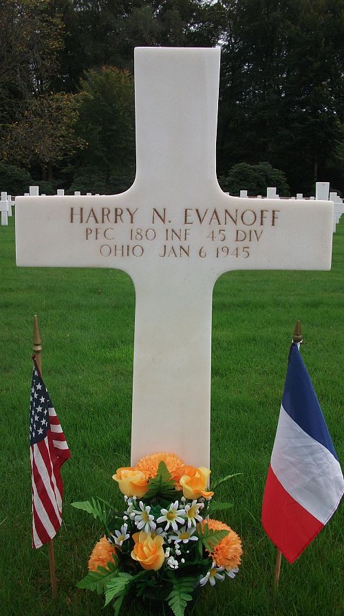 Pfc Harry N. Evanoff enlisted in Toledo, Ohio on 26 October 1943.His brother, Earl A. Evanoff, is buried at Cambridge American Cemetery.