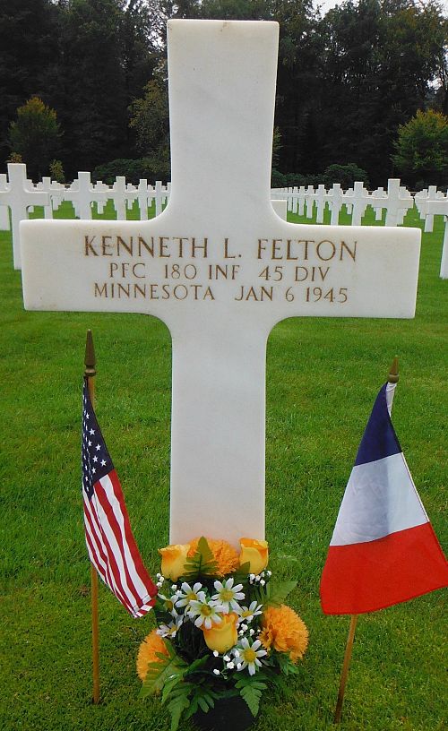 Pfc Kenneth L. Felton attended high school for 4 years and was a driver before he joined the National Guard in Ortenville, Minnesota on 10 February 1941.He was seriously wounded in action near Wingen, France when an artillery shell struck his company command post. He died of his wounds at 116th Evac Hospital in Sarrebourg, France.