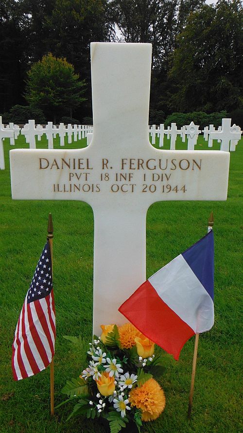 Pvt Daniel R. Ferguson died in France of wounds received 9 October in Aachen, Germany.He was first buried at the Temporary American Military Cemetery in Solers, France.