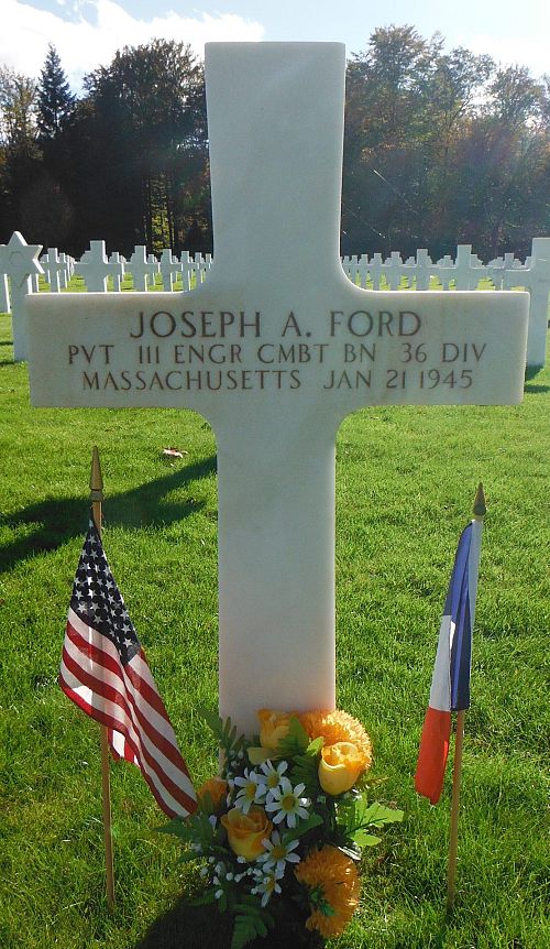 Pvt Joseph A. Ford enlisted in Boston, Massachusetts on 30 April 1943.C Company had early in the morning of 21 January layed a barbed wire fence south of Bischwiller, when an estimated 150 British Mark 5 anti-tank mines exploded. Pvt Ford and seven other men lost their lives and another eight were wounded.