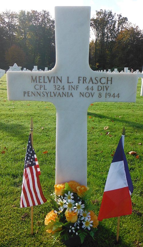 Cpl Melvin L. Frasch enlisted in Harrisburg, Pennsylvania on 20 February 1943 and was sent overseas in September 1944.He was reported seriously wounded in action on 7 November 1944 and died in a hospital due to artillery shell fragments injuries to his lung.