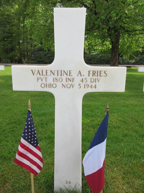 Pvt Valentine A. Fries attended high school for 3 years before he enlisted in Toledo, Ohio, on 19 January 1944. He was stationed at Camp Blanding, Florida and was sent overseas in June 1944, landing in Italy.Since then, he had been on the battlefront continuously until 1 November 1944 when he got a three day rest period behind the lines. He had rejoined his company on the same day he was killed.