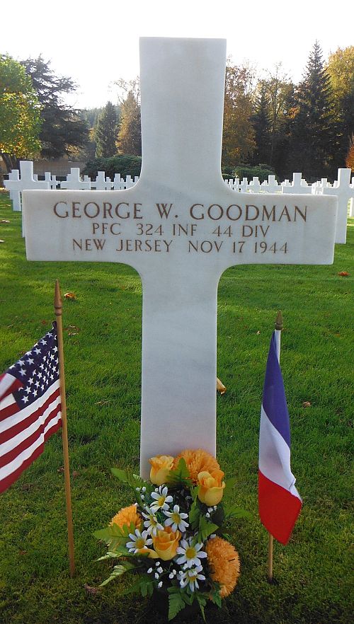 Pfc George W. Goodman attended college for one year before he joined the U.S. Army Reserve in Daytona Beach, Florida on 21 October 1942.He was awarded the Distinguished Service Cross posthumously. The citation cited: for extraordinary heroism in connection with military operations against an armed enemy while serving with B Company, 324th Infantry Regiment, 44th Infantry Division, in action against enemy forces near Embermenil, France, on 14 November 1944. As he advanced across open terrain toward an enemy-held woods, Pfc Goodman, acting scout for his squad, was hit in the leg by a sniper's bullet. He immediately returned the fire either killing or wounding the enemy sniper. During this action a hostile machine gun located on the edge of the woods opened fire on his squad. With complete disregard for his own safety, Pfc Goodman gallantly charged the enemy machine gun nest, firing his rifle as he limped into the hail of enemy fire.