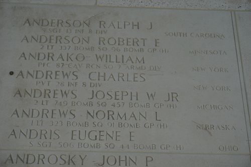 Pvt Charles Andrews graduated from Benjamin Franklin High School and was employed by Bausch & Lomb.On 6 May 2020, the Defense POW/MIA Accounting Agency (DPAA) announced Pvt Andrews was accounted for.