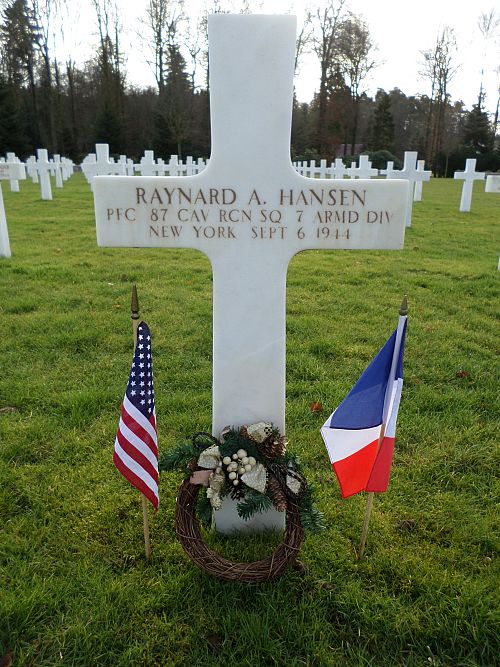 Pfc Raynard A. Hansen enlisted at Camp Upton, New York on 13 March 1942.He was killed by small arms fire in the thorax and arm.