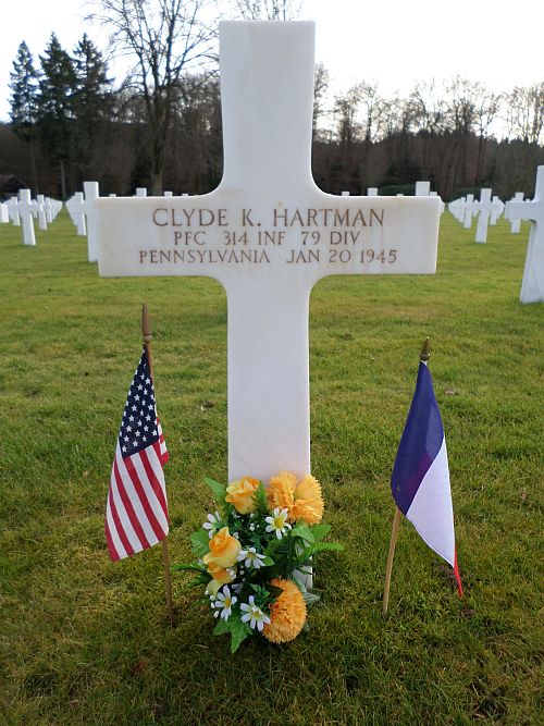 Pfc Clyde K. Hartman attended high school for two years and was a welder before he enlisted in New Cumberland, Pennsylvania on 27 March 1944. He was sent overseas on 20 August 1944.He was killed by artillery shell fragments to his head.
