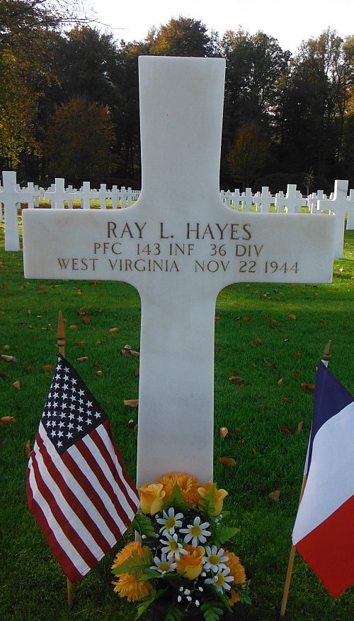 Pfc Ray L. Hayes enlisted in Clarksburg, West Virginia on 10 August 1943.Source of information: André Koch, www.abmc.gov, www.wwiimemorial.com, www.archives.gov - WWII Enlistment Record, www.ancestry.com - Headstone and Interment Record / U.S. WWII Draft Cards Young Men / 1920/1930/1940 Census / New Jersey Marriage Index, www.newspapers.com - The Courier News - 16 August 1944, 12 December 1944, 143rd-October-to-end.pdf, 36thID-roster-part-3.pdf