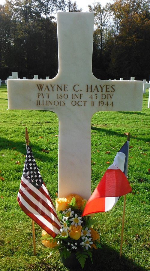 Pvt Wayne C. Hayes attended high school for 1 year before he enlisted in Peoria, Illinois on 12 April 1943.Source of information: Peter Schouteten, www.abmc.gov, www.wwiimemorial.com, www.archives.gov – WWII Enlistment Record, www.ancestry.com - Headstone and Interment Record / 1930 Census, http://www.45thdivision.org. www.newspapers.com – The Decatur Daily Review Illinois 15 November 1944