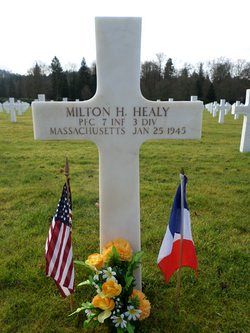 Pfc Milton H. Healy was an operator employed by the Kerr Thread Company, before he enlisted in Boston, Massachusetts on 11 August 1943.He was killed by small arms fire in the thorax.