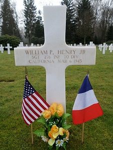 Sgt William P. Henry Jr. enlisted in Berkeley, California on 10 December 1942.He was awarded the Bronze Star Medal posthumously for his action on 27 February 1945 near Stiring-Wendel, France. The citation reads in part: During a hostile counterattack, the enemy was closing in fast, inspired and led by an officer who was shouting orders and words of encouragement. Realizing it was necessary to kill the officer to break the morale of the enemy troops, Sergeant Henry and a comrade rose from their well concealed positions and, though exposed to heavy fire and bursting hand grenades, shot and killed him. The enemy troops, without a leader, turned and fled. Sgt Henry not only contributed toward repelling the counterattack, but undoubtably saved his unit many lives.