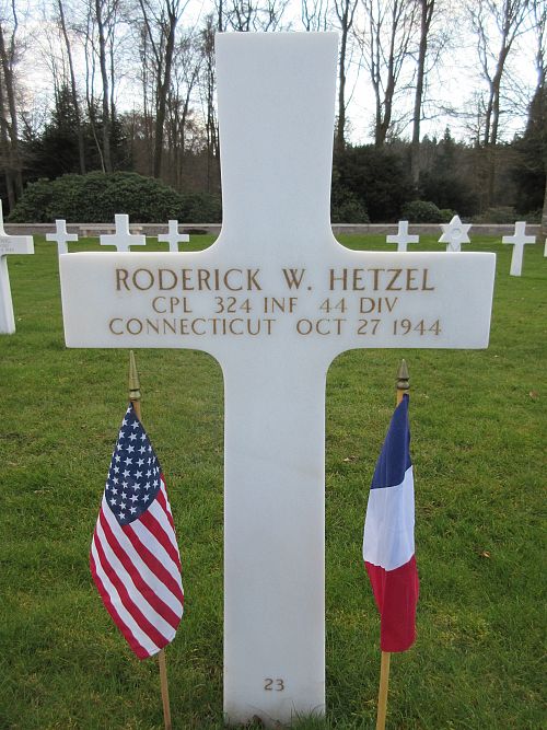 Cpl Roderick W. Hetzel attended college for one year and was employed at the Connecticut Motor Club Travel Counselor before he enlisted in New Haven, Connecticut on 22 March 1943.He died in a hospital to the effects of artillery shell fragments in his chest and femur.