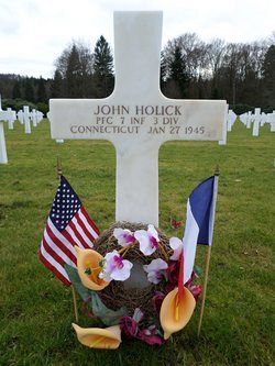 Pfc John Holick attended high school for four years and was a paymaster employed by the Mutual Rough Hat Company, before he enlisted in New Haven, Connecticut on 30 September 1943.In January 1945, he was severely wounded in action by artillery shell fragments in the buttock and hip. He died of his wounds on 27 January. The exact location where he died is not known.