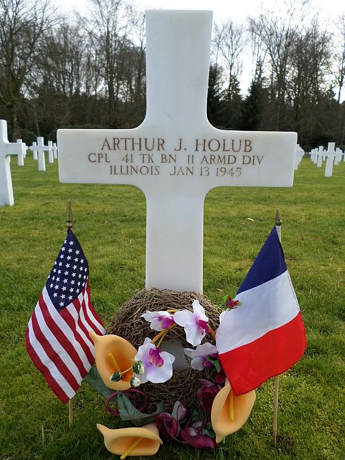 The tank, in which Cpl Holub was a crew member, was knocked out by anti-tank fire on 30 December 1944 in Longleir, Belgium. Another crew member, Pfc John Spero, was killed instantly. He is remembered at Ardennes Cemetery.Cpl Holub died in a hospital. The exact location is not known.