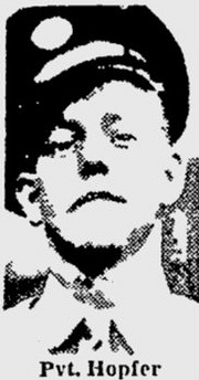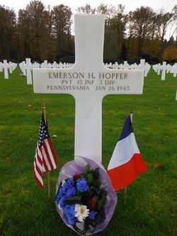 Pvt Emerson H. Hopfer attended high school for four years at the Connelly Trade School and was a welding instructor, employed by the Curtis-Wright Company before he enlisted in Pittsburgh, Pennsylvania on 20 January 1944. He was sent overseas in July 1944.He was killed by artillery shell fragments in the abdomen, pelvis, back and shoulder.