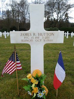 Pfc James R. Hutton attended high school for three years and was a shipping clerk, employed by the Barrett Hardware Company, before he enlisted in Chicago, Illinois on 2 December 1942.He was wounded at his foot by artillery shell fragments, but died in a hospital of a pneumococcal lobar. The exact location of the hospital where he died is not known.