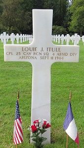 He was awarded the Bronze Star Medal posthumously. The citation cited: On September 10, 1944, Cpl Louie J. Itule was placed in charge of a bridge reconnaissance party. It's mission was to investigate the bridges across the Moselle river west of Bayon, France. In the act of investigating one of the bridges, Cpl Itule was fatally wounded by an enemy anti-personnel mine. His party acquired valuable information relative to fords across the Moselle river, and also significant information pertaining to the extent of the damage to a vital bridge over the canal in the vicinity. This mission was completed regardless of the fact that the enemy had the area well covered with machine gun and small arms fire. The sacrifice made by Cpl Itule was supreme. In giving his life the success of his organization's mission was made more secure. He performed his duty without hesitation in a manner market by courage and determination.