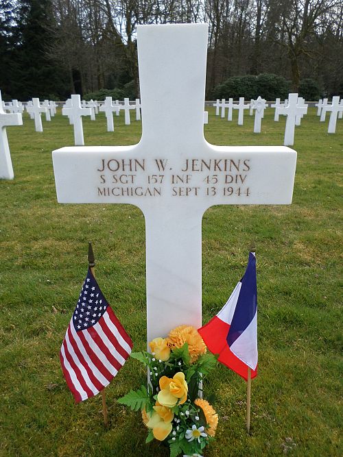 S/Sgt John W. Jenkins attended high school for 3 years before he enlisted in Detroit, Michigan on 15 April 1941.He was first buried at the Temporary American Military Cemetery in Saint-Juan, France.
