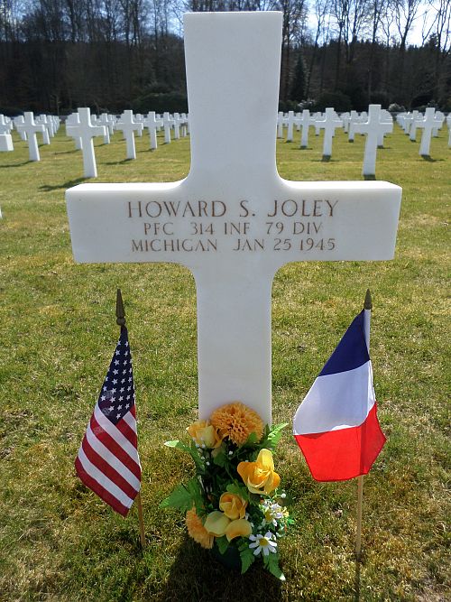 Pfc Howard S. Joley was employed by the Lansing Dairy Company before he enlisted in October 1944.Source of information: Peter Schouteten, www.abmc.gov, www.wwiimemorial.com, www.ancestry.com - Headstone and Interment Record / U.S. WWII Draft Cards Young Men / Bonevich Family Tree / Michigan Marriage Records, Combat History 314th Infantry Regiment, www.findagrave.com – MAJ Jimmy Cotton / Glenn Geirland
