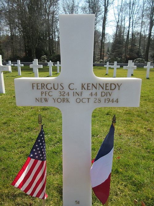 Pfc Fergus C. Kennedy attended Manhattan College for one year before he joined the U.S. Army Reserve in New York City, New York on 2 December 1942. He was sent overseas in September 1944.Source of information: Peter Schouteten, www.abmc.gov, www.wwiimemorial.com, www.archives.gov – WWII Enlistment Record, www.ancestry.com - Headstone and Interment Record / 1940 Census / U.S. WWII Draft Cards Young Men / New York Birth Index, www.findagrave.com – Anonymous, www.newspapers.com – The Tablet New York 18 November 1944